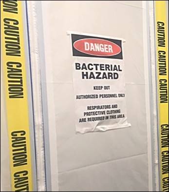Photographs show signs that were posted by authorities, one warning of asbestos and another of “bacterial hazard” contamination.